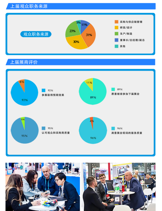 3.观众的职务:70%来自董事长、总经理、副总经理、总工程师、部门经理、采购经理、技术员、设计师、研发人员;其他职务占比30%。