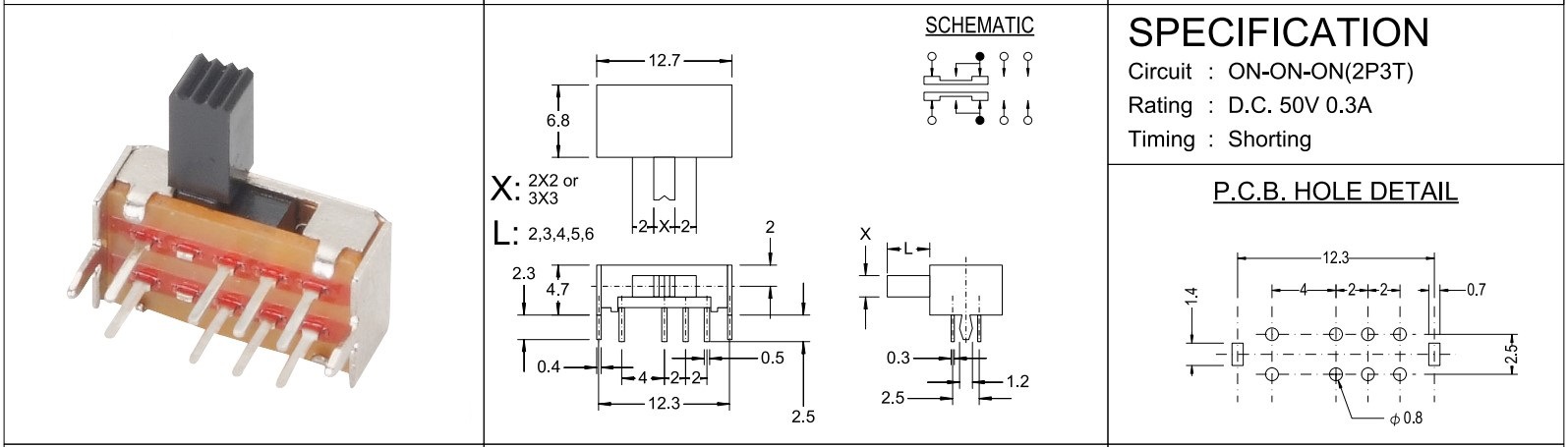 | 名称:拨动开关 | 安装方式: 侧拨 卧式2P2T | 产地: | 广东省东莞市 | ||