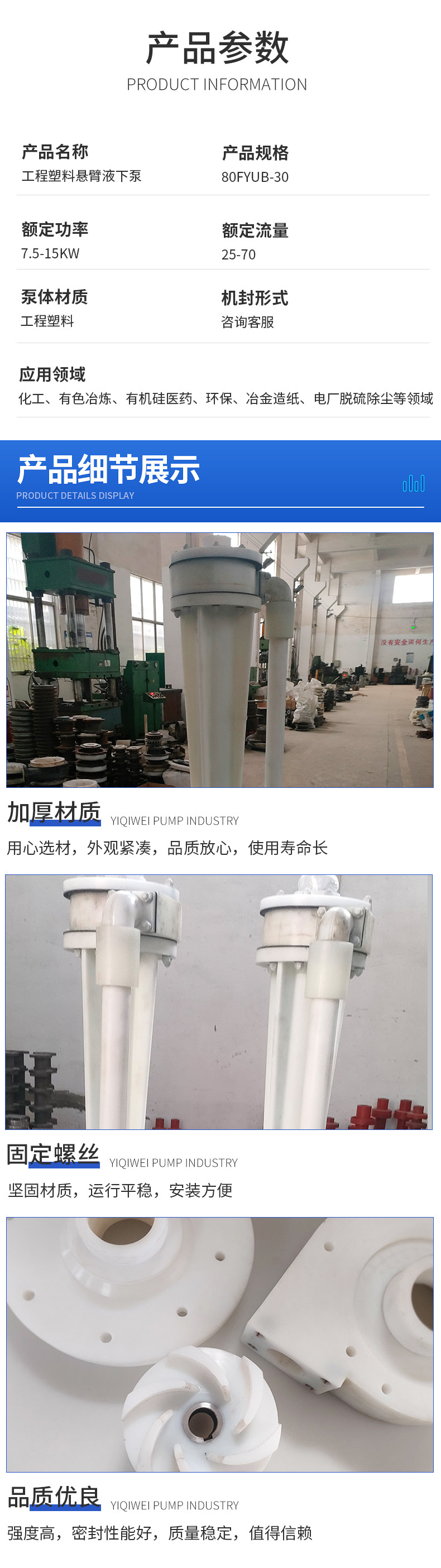 本网页所展示的有关【厂家 工程塑料悬臂液下泵80FYUB耐酸碱防腐蚀_塑料泵_无锡易奇威泵业制造有限公司】的信息/图片/参数等由中国机电设备产业网的会员【无锡易奇威泵业制造有限公司】提供,由中国机电设备产业网会员【无锡易奇威泵业制造有限公司】自行对信息/图片/参数等的真实性、准确性和合法性负责,本平台(本网站)仅提供展示服务,请谨慎交易,因交易而产生的法律关系及法律纠纷由您自行协商解决,本平台(本网站)对此不承担任何责任。您在本网页可以浏览【厂家 工程塑料悬臂液下泵80FYUB耐酸碱防腐蚀_塑料泵_无锡易奇威泵业制造有限公司】有关的信息/图片/价格等及提供【厂家 工程塑料悬臂液下泵80FYUB耐酸碱防腐蚀_塑料泵_无锡易奇威泵业制造有限公司】的商家公司简介、联系方式等信息。