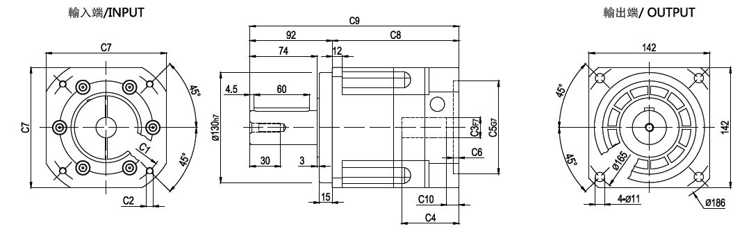 2、输出轴采用双轴承支撑,承载扭矩大,噪音低