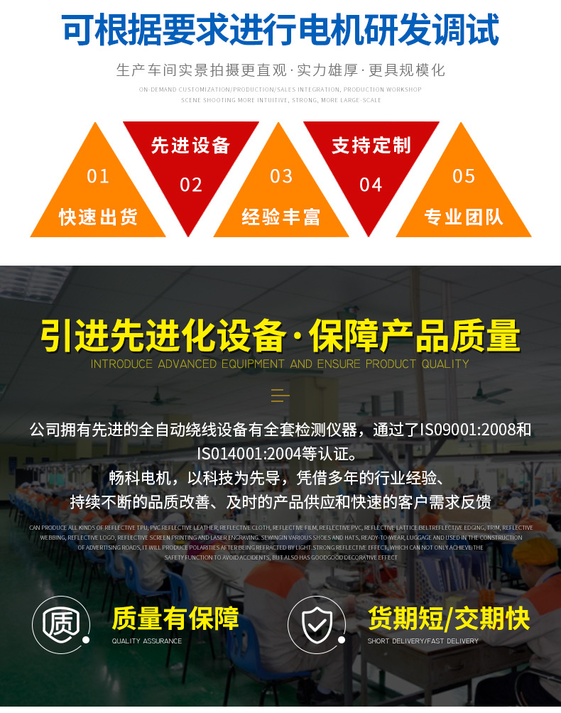 公司拥有先进的全自动绕线设备有全套检测仪器,通过了IS09001:2008和IS014001:2004等认证。畅科电机,以科技为先导,凭借多年的行业经验、持续不断的品质改善、及时的产品供应和快速的客户需求反馈,畅科电机在客户中树立了良好的口碑,产品畅销中国、美国、欧洲、韩国和东南亚等国家和地区。